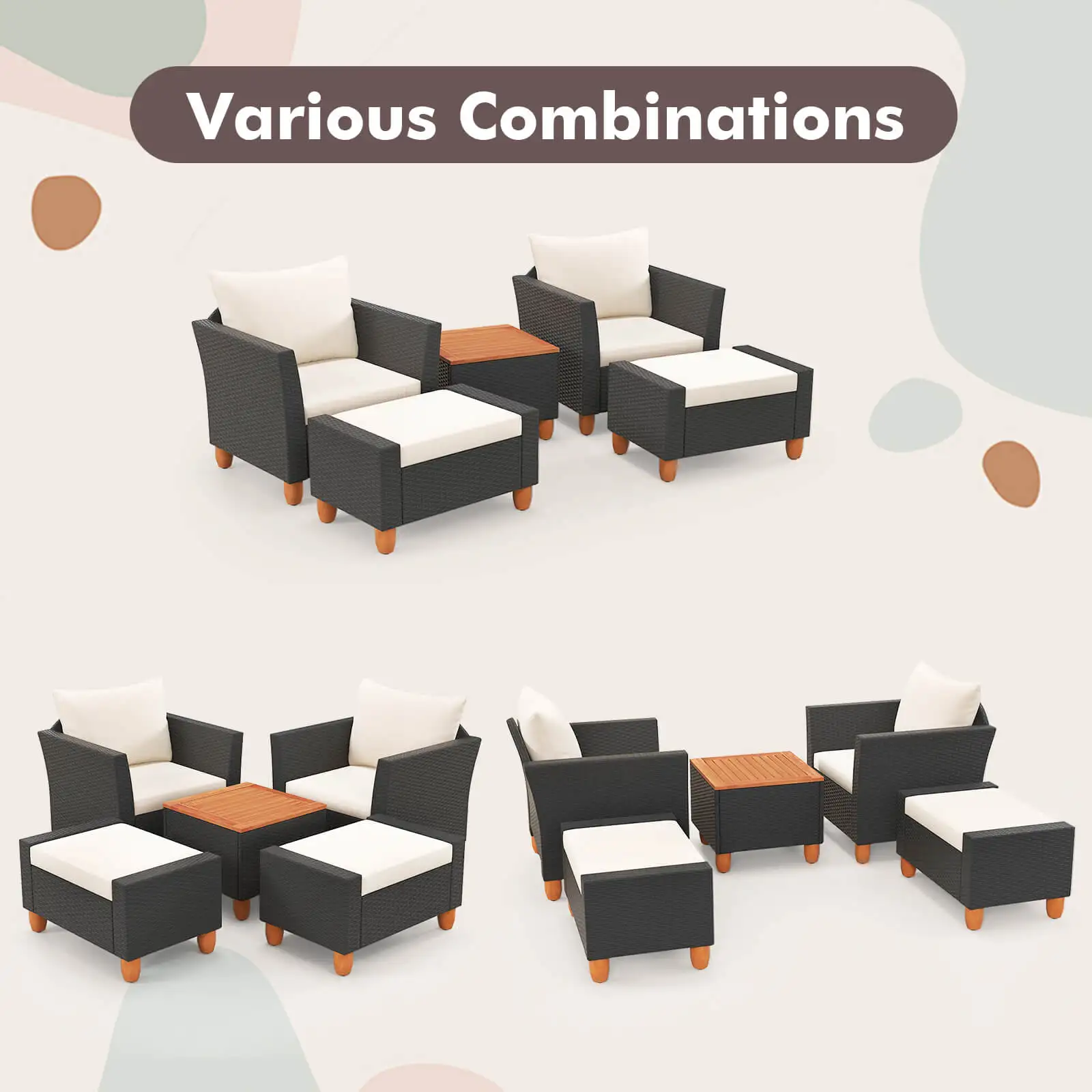 with ample interior storage space, the side table keeps your outdoor essentials neatly organized and easily accessible. The soft pillows and cushions provide unparalleled coziness, with smooth zippers making their covers easy to remove and maintain. The ottomans can be used as footrests, extra seating options, or even coffee tables, adding versatility to your outdoor space. Made from hand-woven PE rattan and high-quality acacia wood, this patio conversation set promises longevity and sturdiness. Each armchair and ottoman supports 400 lbs, while the storage table holds 240 lbs. This outdoor furniture set offers various layout options, allowing you to enjoy leisure time outdoors no matter where you are.