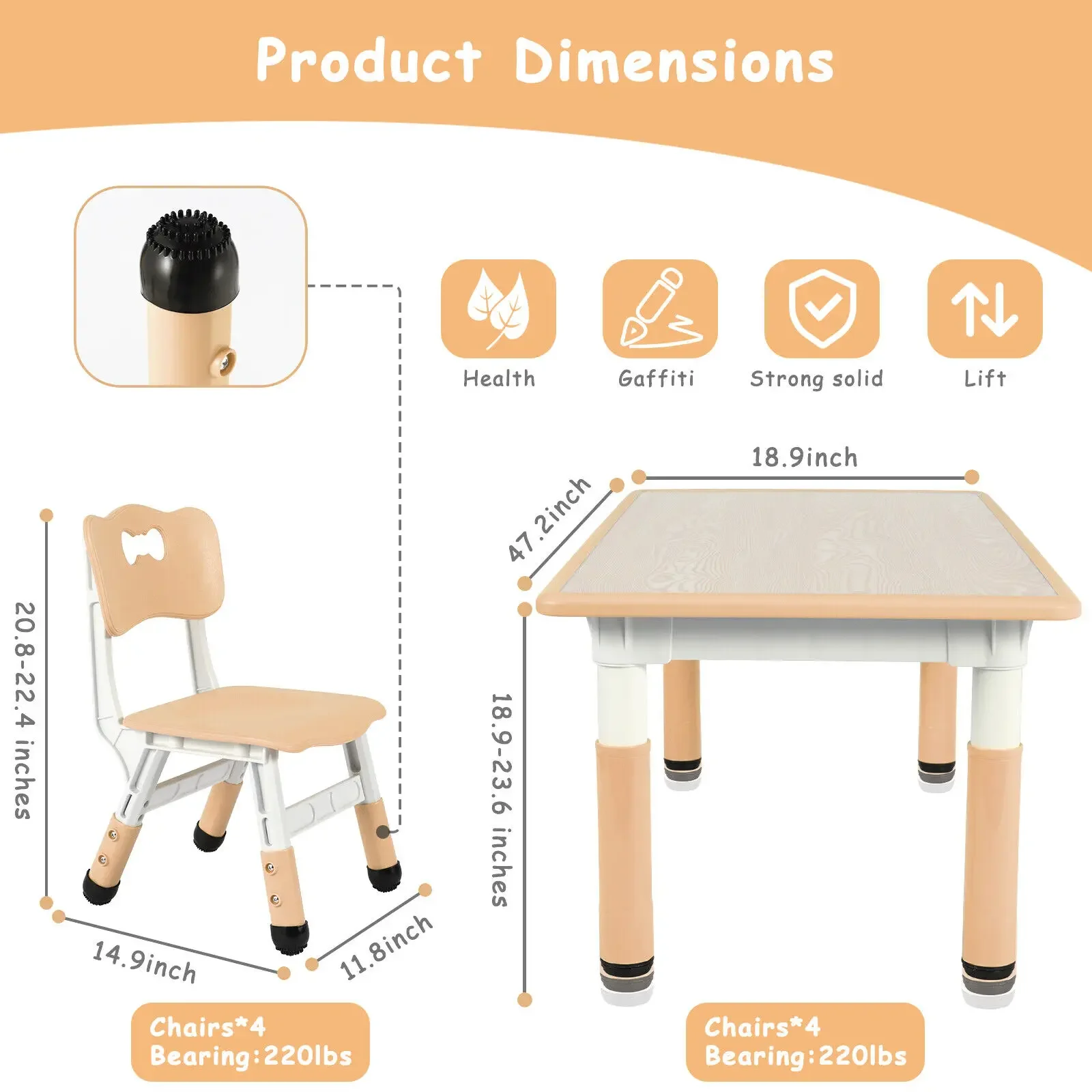 [BOTH TABLE & CHAIRS HEIGHT-ADJUSTABLE] 5 levels height adjustable table from 18.9 to 23.6 inches, 3 levels for chairs adjust from 20.8 to 22.4 inches. Kids table and chair set is a great fit for your children growing up, recommended for age 2-10 years old.